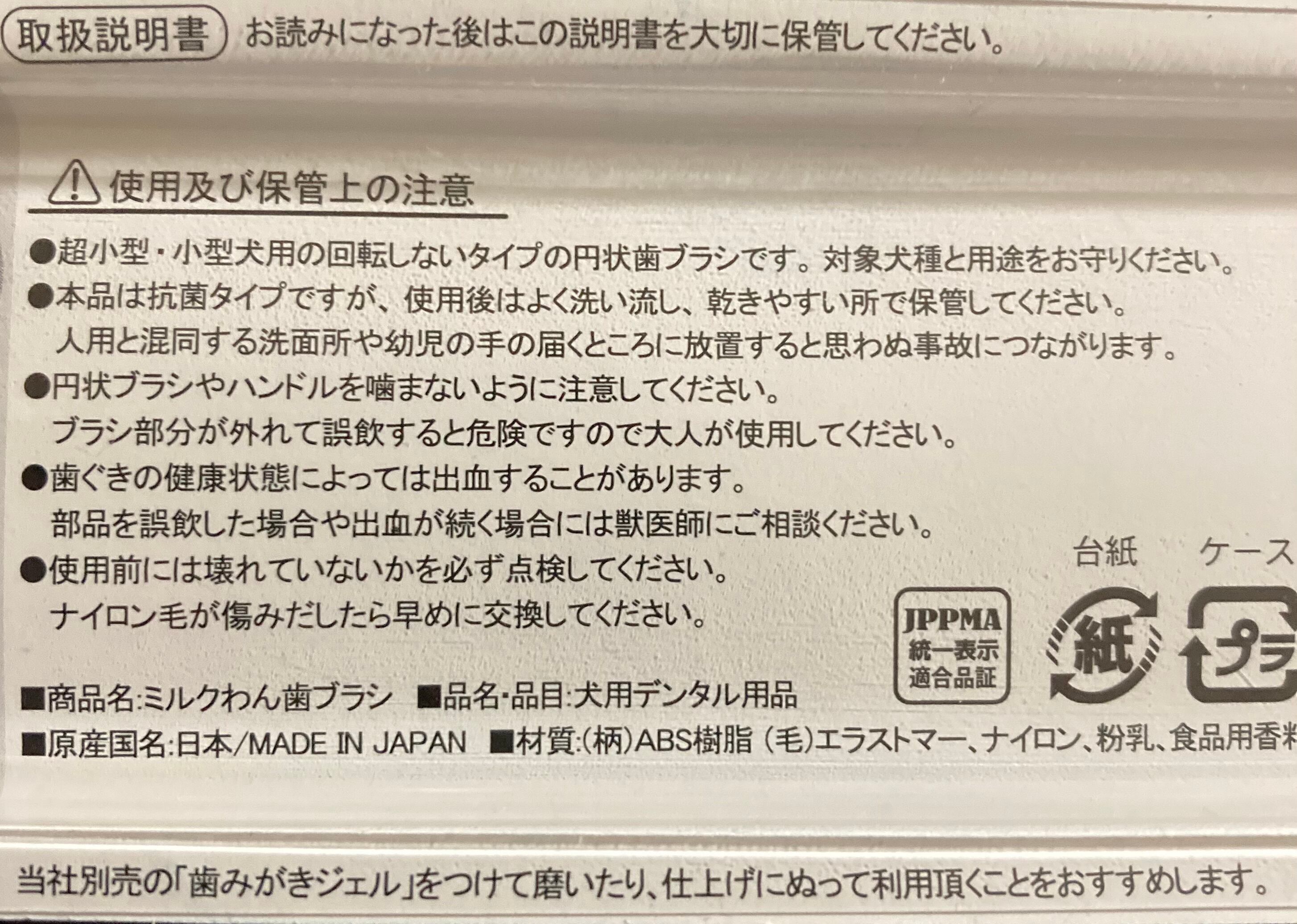 毛:エラストマー、ナイロン(抗菌)、粉乳、食品香料